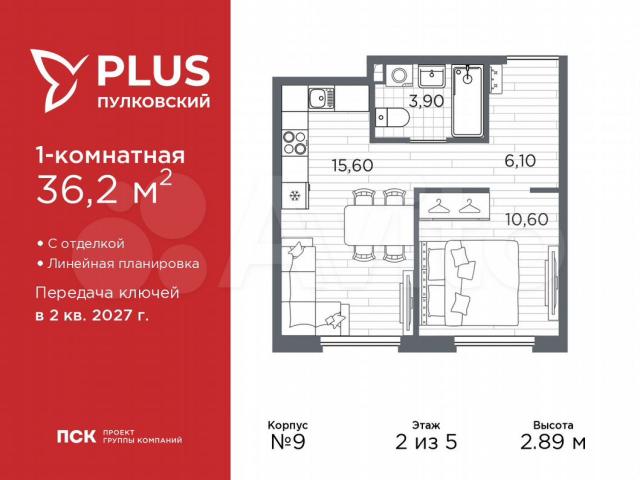 Важное преимущества отделки от застройщика в гарантии на все работы и в том, что фактическая стоимость полной отделки распределяется в ипотечных платежах при покупке в ипотеку.Дом монолитный, трехподъездный, высотой 5 этажей. Квартира находится в 1-й секции в корпусе 9. На этаже 6 квартир. В подъезде 1 грузовой лифт. Окончание строительства - 2 квартал 2027 года. Оформление сделки по договору долевого участия.ЖК «РLUS Пулковский» расположен в престижном Московском районе на пересечении Пулковского и Волхонского шоссе, по которым можно быстро добраться до КАД и до станций метро Московская и Звёздная.Поблизости расположены дворцово-парковые ансамбли Пушкина, Павловска, Петергофа, Гатчины, Ломоносова, а также вся торговая и развлекательная инфраструктура: ТК Лето, Оutlеt Villаgе Рulkоvо, Пулково-3, гипермаркеты Лента, Окей, Меtrо.На территории комплекса будут построены средняя образовательная школа на 825 мест с двумя бассейнами, 2 детских сада на 220 мест каждый. В детских садах тоже будут бассейны. Кроме этого будет построен медицинский центр для взрослых и детей.Во дворах буду оборудованы спортивные и безопасные детские площадки, на первых этажах домов будут расположены коммерческие помещения. Для автолюбителей будут подземные и наземный паркинги.Для жителей домов будет доступно "приложение жителя", которое предоставит такие возможности: