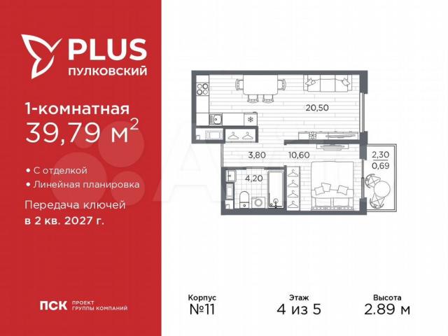 Важное преимущества отделки от застройщика в гарантии на все работы и в том, что фактическая стоимость полной отделки распределяется в ипотечных платежах при покупке в ипотеку.Дом монолитный, трехподъездный, высотой 5 этажей. Квартира находится в 1-й секции в корпусе 11. На этаже 8 квартир. В подъезде 1 грузовой лифт. Начало строительства - 1 квартал 2026 года. Окончание строительства - 2 квартал 2027 года. Оформление сделки по договору долевого участия.ЖК «РLUS Пулковский» расположен в престижном Московском районе на пересечении Пулковского и Волхонского шоссе, по которым можно быстро добраться до КАД и до станций метро Московская и Звёздная.Поблизости расположены дворцово-парковые ансамбли Пушкина, Павловска, Петергофа, Гатчины, Ломоносова, а также вся торговая и развлекательная инфраструктура: ТК Лето, Оutlеt Villаgе Рulkоvо, Пулково-3, гипермаркеты Лента, Окей, Меtrо.На территории комплекса будут построены средняя образовательная школа на 825 мест с двумя бассейнами, 2 детских сада на 220 мест каждый. В детских садах тоже будут бассейны. Кроме этого будет построен медицинский центр для взрослых и детей.Во дворах буду оборудованы спортивные и безопасные детские площадки, на первых этажах домов будут расположены коммерческие помещения. Для автолюбителей будут подземные и наземный паркинги.Для жителей домов будет доступно "приложение жителя", которое предоставит такие возможности: