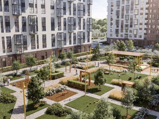 Современные монолитные дома высотой 12 этажей с общим цоколем — это про сдержанность и элегантность. А динамику фасадам добавляют яркие акценты — в сочетании оттенков угадываются цвета северных ягод и растений. Внутренний дворЧтобы провести незабываемые выходные, не обязательно далеко уходить от квартала. Просто спуститесь во двор и окажитесь в «лесных гостиных». Это уютные лаунж-пространства с навесами, игровыми площадками и столом для настольных игр. В каждом дворе — уникальная «гостиная» в своей цветовой гамме с композициями из растений и кустарников. Но объединяет их дизайн-код «Северные ягоды». Прогуляйтесь по территории квартала и побывайте в каждом уютном уголке. Здесь можно устроиться с чашкой кофе или посидеть в сквере с интересной книгой. Покататься на велосипеде по дорожкам, встретиться с соседями на зеленом бульваре или сходить на тренировку на свежем воздухе. Родители смогут спокойно отпускать детей на детские и спортивные площадки, ведь дворы закрыты для посторонних.Входные группыВходы в подъезды — на уровне земли, без ступенек и порогов. Смело возвращайтесь с прогулки с коляской или из отпуска с чемоданом. Путь будет удобным и легким.Для хранения сезонных вещей мы предусмотрели кладовые на подземных этажах. Оставлять коляски и велосипеды можно в специальных помещениях на первом этаже. Отделка