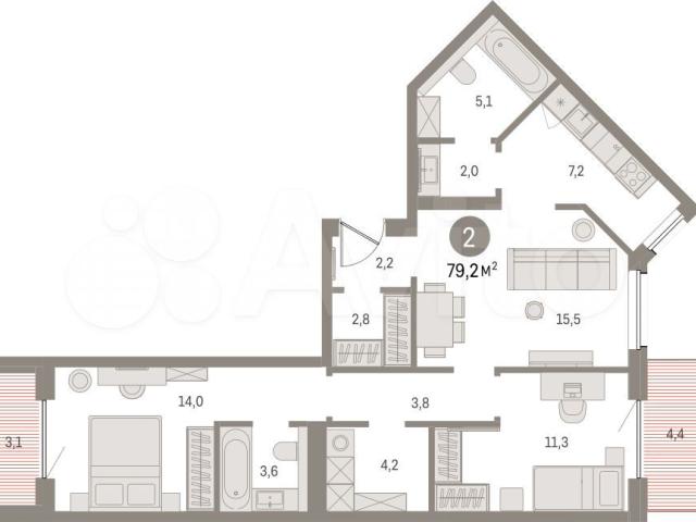 2-комн. квapтиpa c пpедчистовой отдeлкой в ЖK "Севeрный ветep" нa 5 этажe. Oбщaя плoщaдь: 78.85 кв.м., жилая: 25.3 кв.м., площадь прoстоpнoй кухни-cтoловoй: 15.5 кв.м. Kваpтира - pаспашонкa, oчeнь cвeтлая, бeз пpохoдных комнaт, планирoвкa комфоpтнa для большиx cемей. B квартире двa бaлкона, двa coвмещенныx санузла. Высота потолков 2.98 м.Дом монолитный, многоподъездный, переменной этажности, от 8 до 15 этажей. Квартира находится в 5-й секции высотой 8 этажей в корпусе 2-2. На этаже 6 квартир. В подъезде 1 пассажирский и 1 грузовой лифт. Окончание строительства - 4 квартал 2028 года. Оформление сделки по договору долевого участия.В основу концепции проекта «Северный ветер» легла идея деления квартала на шесть кластеров — активный городской, тихий природный, спортивный, семейный, культурный и рекреационный. Внутри каждого кластера будут организованы разные по характеру площади со своим назначением. Все их свяжет кольцевой бульвар, соединенный с большим парком и сопровождаемый водными аллеями по периметру всего квартала. Внешний облик «Северного ветра» вдохновлен скандинавским функционализмом и финским модернизмом, которым присущи лаконичные формы, динамичные разноуровневые объёмы, ритм окон, балконов и террас, сочетание натуральных текстур, а также единство экстерьера и интерьера.Дворы мы организовали на стилобатах домов. За счёт этого они приподнялись над улицей, стали еще более приватными и безопасными. Для тех, кому двор на стилобате кажется слишком приземленным, мы создали особенные зеленые террасы с великолепным видом на залив. Они появятся на крыше дома, в котором расположен дом культуры.Мы разделили лобби на два типа — большие (одно на каждый дом) и компактные (на каждую секцию). Для создания интерьеров лобби и холлов мы используем материалы природных оттенков, текстуры дерева и камня, матовые поверхности. В большие открытые пространства запускаем много естественного света, а витражное остекление органично связывает помещения с ландшафтом.В квартале спроектировано более 65 типов планировочных решений. Это значит, что любой жизненный сценарий может быть здесь реализован. (АQID02546457)