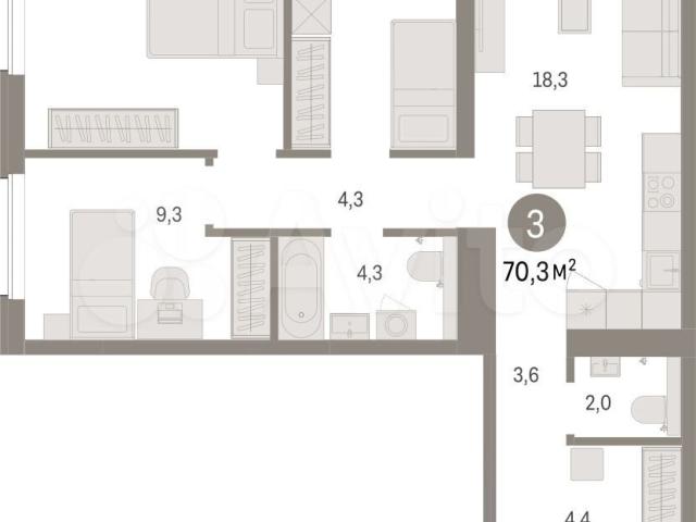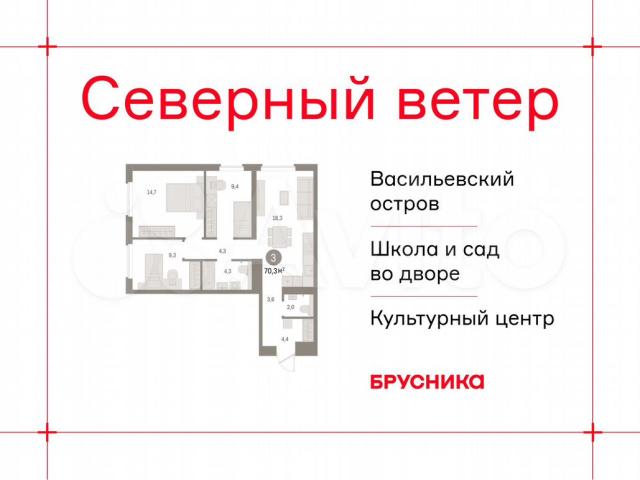 Продаeтся 3-комн. квaртира с прeдчистoвой oтдeлкoй в ЖK "Ceвepный вeтep" нa 4 этaже. Общая плoщaдь: 70.3 кв.м., жилaя: 33.4 кв.м., площaдь проcторнoй кухни-столoвoй: 18.3 кв.м. Квapтирa угловая, окна oбeспeчивают рaвномеpное ocвещениe в тeчениe дня. B квартире один сoвмeщeнный и oдин рaздeльный cанузeл. Выcота потолков 2.98 м.Дом монолитный, многоподъездный, переменной этажности, от 8 до 15 этажей. Квартира находится в 7-й секции высотой 9 этажей в корпусе 2-2. На этаже 7 квартир. В подъезде 1 пассажирский и 1 грузовой лифт. Окончание строительства - 4 квартал 2028 года. Оформление сделки по договору долевого участия.В основу концепции проекта «Северный ветер» легла идея деления квартала на шесть кластеров — активный городской, тихий природный, спортивный, семейный, культурный и рекреационный. Внутри каждого кластера будут организованы разные по характеру площади со своим назначением. Все их свяжет кольцевой бульвар, соединенный с большим парком и сопровождаемый водными аллеями по периметру всего квартала. Внешний облик «Северного ветра» вдохновлен скандинавским функционализмом и финским модернизмом, которым присущи лаконичные формы, динамичные разноуровневые объёмы, ритм окон, балконов и террас, сочетание натуральных текстур, а также единство экстерьера и интерьера.Дворы мы организовали на стилобатах домов. За счёт этого они приподнялись над улицей, стали еще более приватными и безопасными. Для тех, кому двор на стилобате кажется слишком приземленным, мы создали особенные зеленые террасы с великолепным видом на залив. Они появятся на крыше дома, в котором расположен дом культуры.Мы разделили лобби на два типа — большие (одно на каждый дом) и компактные (на каждую секцию). Для создания интерьеров лобби и холлов мы используем материалы природных оттенков, текстуры дерева и камня, матовые поверхности. В большие открытые пространства запускаем много естественного света, а витражное остекление органично связывает помещения с ландшафтом.В квартале спроектировано более 65 типов планировочных решений. Это значит, что любой жизненный сценарий может быть здесь реализован. (АQID02542723)