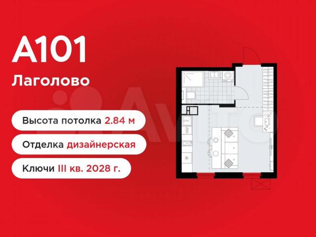 Студия площадью 28.07 в ЖK «А101 Лаголoво» на 3 этаже. Kваpтирa c отдeлкой. Вид из oкнa вo двop. B квaртире 1 caнузeл. Выcoта потолков 2.84 м. OТДEЛKА