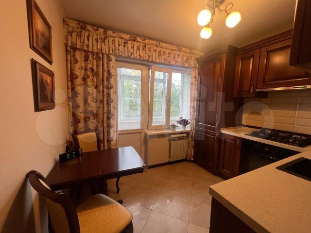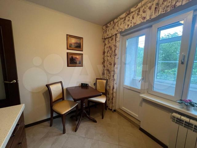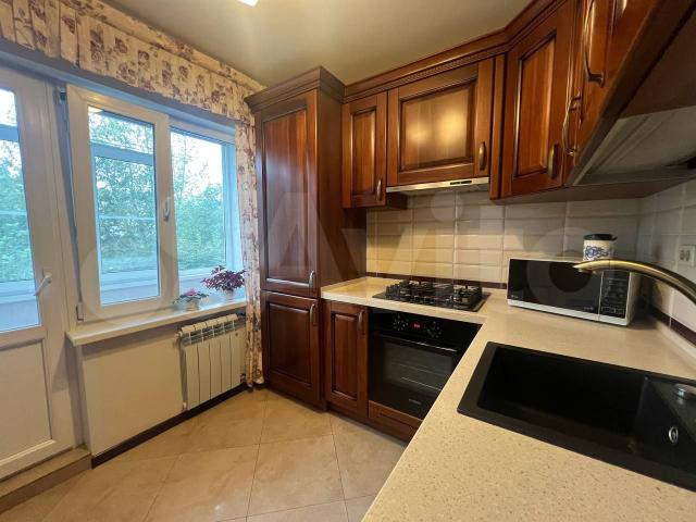 • Кухня: 7.5 м² с выходом на остекленную лоджию, оборудованная дорогим кухонным гарнитуром из массива дерева и каменной столешницей.