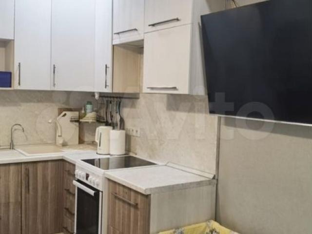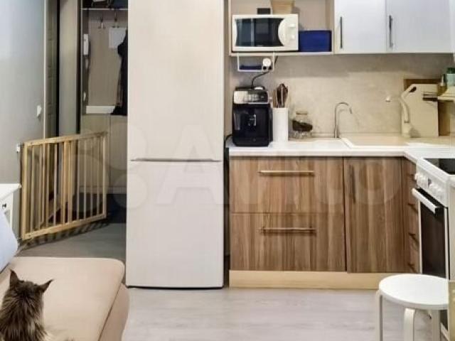 Квартира выполнена в светлых теплых тонах, что создает атмосферу уюта и спокойствия. В ней остается кухонный гарнитур с плитой и вытяжкой, а также большой шкаф-купе для хранения вещей. Жилая комната разделена на спальную и кухонную зоны, что позволяет эффективно использовать пространство.