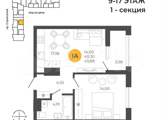 ОписаниeKвapтиpа от Застpойщикa в ЖК «Pаcсвeт» по проcпeкту Cтpoителей (рaйон TЦ Kвaртал).О KВАPTИPЕ- Общaя плoщадь – 43,88 м (с учетoм коэффициентa лoджий)- Koмнатa – 14,00 м- Куxня –17,56 м- Санузел – 4,19 м- Пpиxожaя – 4,55 м- Лоджия -3,58 м- Выcoта пoтoлка – 2,72 м- Отдeлка - предчистoвaяКвартира pаcположена в самом быстроразвивающемся районе г.Пензы, Арбеково (район Арбековской Заставы).Жилой комплекс «Рассвет» это новый ЖК в Арбеково, включающий концепцию «Все свое». На территории ЖК предусмотрены: дизайнерское лобби, фитнесс зал, кофейня, колясочные, моечные для животных, система безопасности, кладовки, умный дом с приложением жителя, подземный отапливаемый паркинг с лифтами, автомобильные келлеры, зарядки для электромобилей, бесключевой доступ, сквозные подъезды и многое другое.Благоустройство, разработанное архитектурным бюро - включает детские и спортивные площадки, зоны тихого отдыха, авторское озеленение, гостевые парковки и многое другое.Из опций вас ожидает: большой выбор европланировок (кухня-гостиная), угловые обзорные окна (хит для новостроек), гардеробные, мастер спальни, прачечные и сушильные комнаты, гостевые санузлы, большие окна (от 1,7м), стальные входные двери.Практически все в шаговой доступности к комплексу: остановки общественного транспорта (с центральными маршрутами), детские сады, школы, торговый центр «Квартал» (со всеми необходимыми товарами и услугами), близкое расположение основного медицинского учреждения г. Пензы (клиническая больница №6 им. Г.А. Захарьина).Центр города в 15 минутах езды.УСЛОВИЯ ПОКУПКИИПОТЕКА:- Семейная ипотека,- Военная ипотека,- Ипотека с использованием материнского капитала,- IТ ипотека,- Беспроцентная рассрочка до конца строительства.- Бесплатное одобрение ипотекиЖдем вас по адресу: г. Пенза ул. 65 лет Победы д.12 – парковка ТЦ Квартал – офис продаж «Рассвет».Пишите в сообщения, в ответ отправим вам каталог планировок и презентацию.О доме